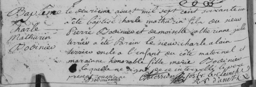 Fils de Pierre, et de Catherine-Julie Terrier, Charles-Mathurin Bodinier, est né à Anetz (44) en 1761 et fut baptisé le 2 août de la même année.