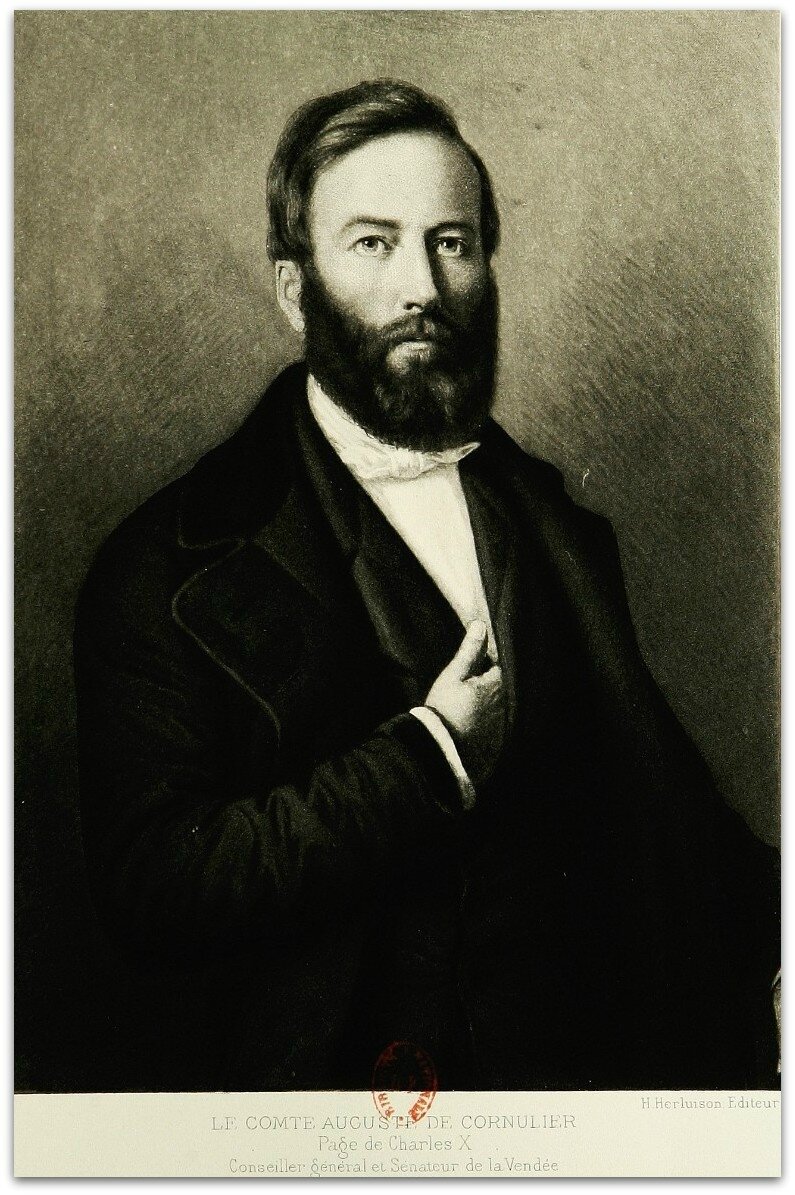 1° Auguste-Louis-Marie de Cornulier, né à Nantes (3e et 4e cantons) le 23 septembre 1812 ; se destinait à la carrière des armes et était page du roi Charles X, en 1829. La Révolution de Juillet l'obligea à renoncer à cette vocation. De retour dans ses foyers, il prit part, avec son père, au mouvement légitimiste de la Vendée, en 1832. Dans une rencontre avec la troupe, il essuya un coup de feu à bout portant, et n'échappa à la mort que par une sorte de miracle. Arrêté à la suite de ces évènements, il subit, dans la prison de La Roche-sur-Yon, une détention préventive de quatre mois avant d'être rendu à la liberté par une ordonnance de non-lieu. Après être resté longtemps en dehors des affaires publiques, un jour vint où il consentit à accepter l'administration de sa commune. Ce qu'il y fit de bien est immense ; il suffit de dire qu'il entreprit et mena à bonne fin un long et difficile procès qui procura à sa chère commune des ressources précieuses. Depuis 1868, il était membre du conseil général de la Vendée et maire de la commune de Saint-Hilaire-de-Loulay, près de Montaigu, où est situé son château de la Lande. C'est malgré lui qu'il fut élu sénateur par le département de la Vendée, le 30 janvier 1876, et c'est encore en lui faisant violence que les électeurs sénatoriaux le renommèrent le 8 janvier 1882, alors qu'il avait manifesté la résolution de se retirer de la vie politique. Il avait su garder dans son pays toute l'estime, la considération et la popularité dont son père y jouissait ; de là la violence honorable faite à son inclination. Il est mort à Paris le 13 février 1886, et a été inhumé à Saint-Hilaire-de-Loulay. Homme de devoir avant tout, d'un caractère modeste, aimable et conciliant, il s'était fait de nombreux amis, et ceux-là mêmes qui ne partageaient pas ses convictions lui accordaient sans réserve leurs respects, et reconnaissaient sa capacité administrative. Au Sénat, il vota constamment avec la droite. Il est décédé à Paris en 1886.